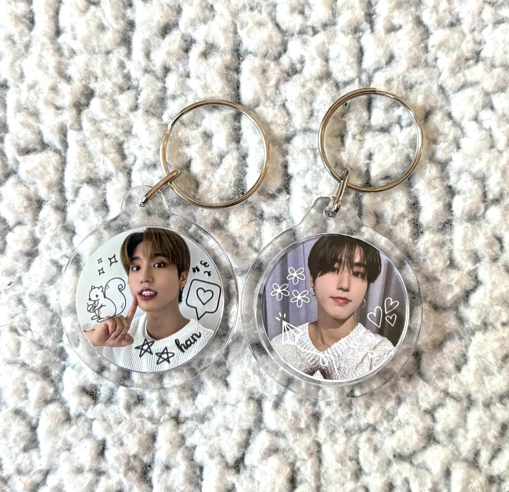 These keychains are double-sided with a different photo on each side. There are also doodles on each photo, each keychain featuring a doodle of the member's representative emoji! These are a cute accessory for your backpack, concert bag, lanyards, or wherever you want to show them off :)